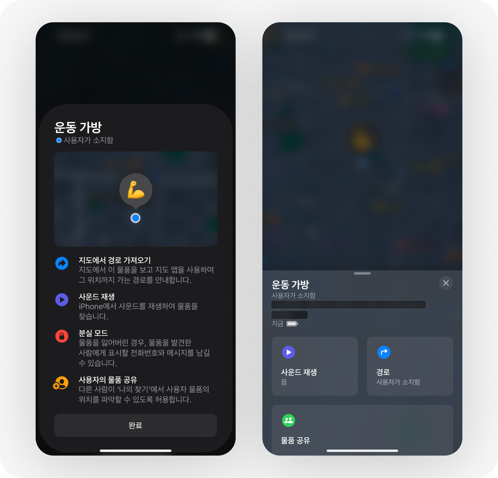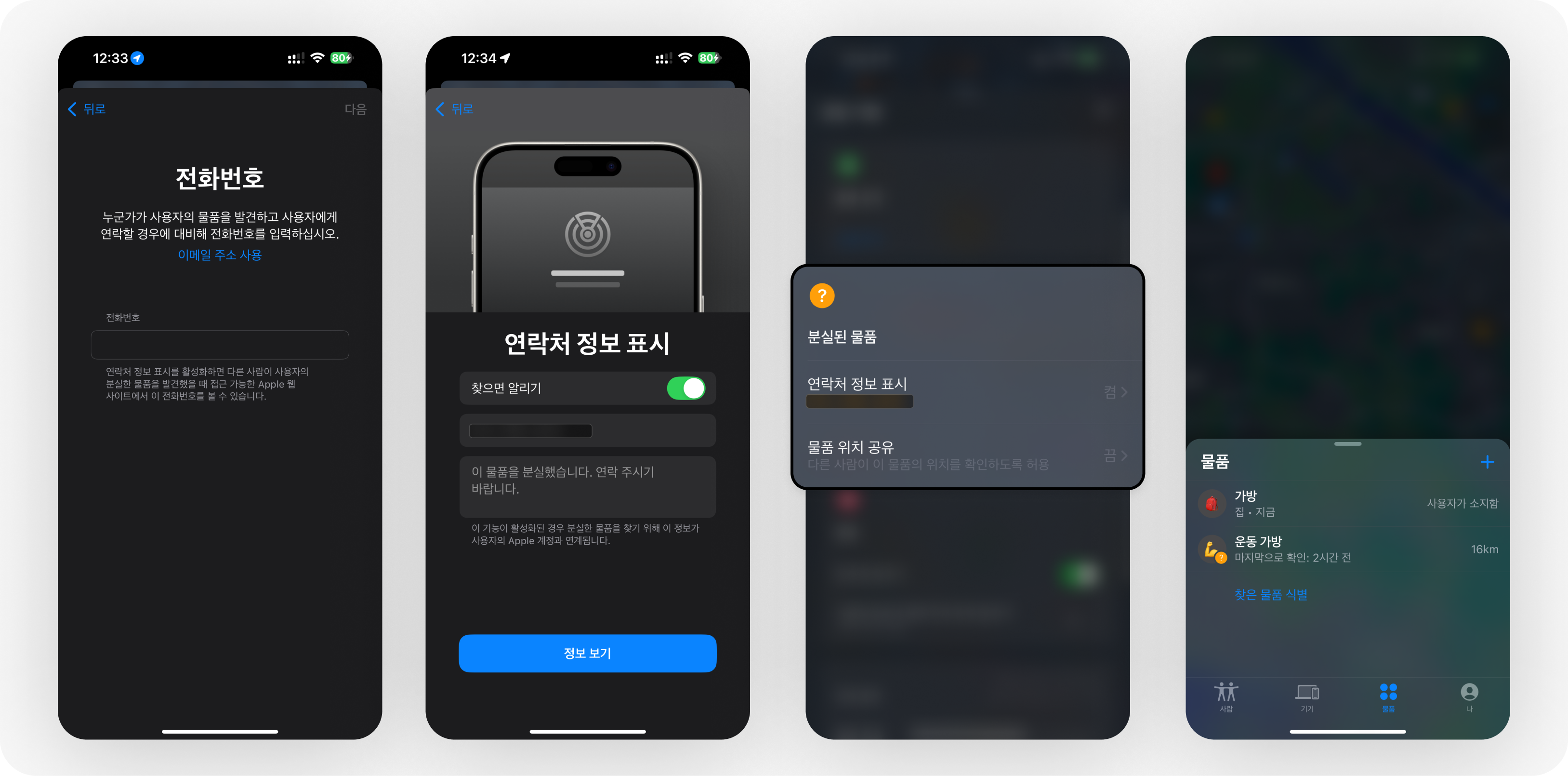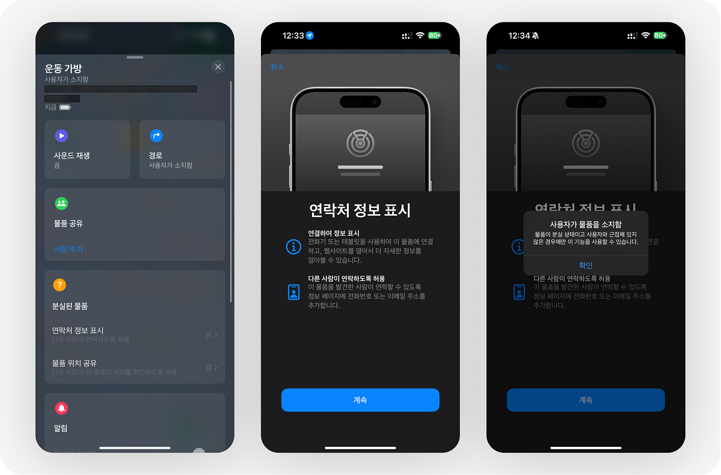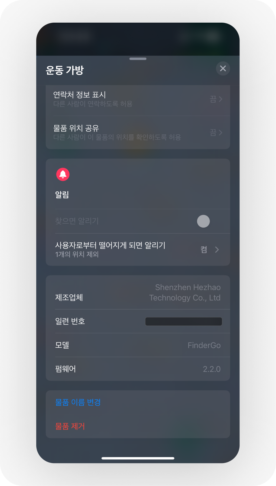 분실물 습득자가 연락처와 위치를 확인할 수 있는 기능은 제품과 멀리 떨어져 있을 때(분실 시)에만 활성화됩니다.