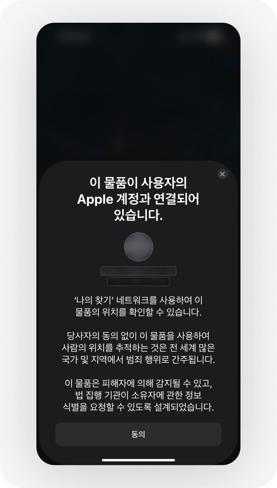 타인의 위치 추적 목적으로 사용 시 상대방에게 경고 알림이 전송되고 불법 행위에 해당할 수 있다는 안내가 나타나며 동의하면 등록이 완료됩니다. 실제로 일정 시간 동안 Apple 기기를 소지한 타인과 함께 이동하면 상대방에게 알림이 전송되고, 나중에는 스마트 태그에서 알림음이 발생한다고 해요.