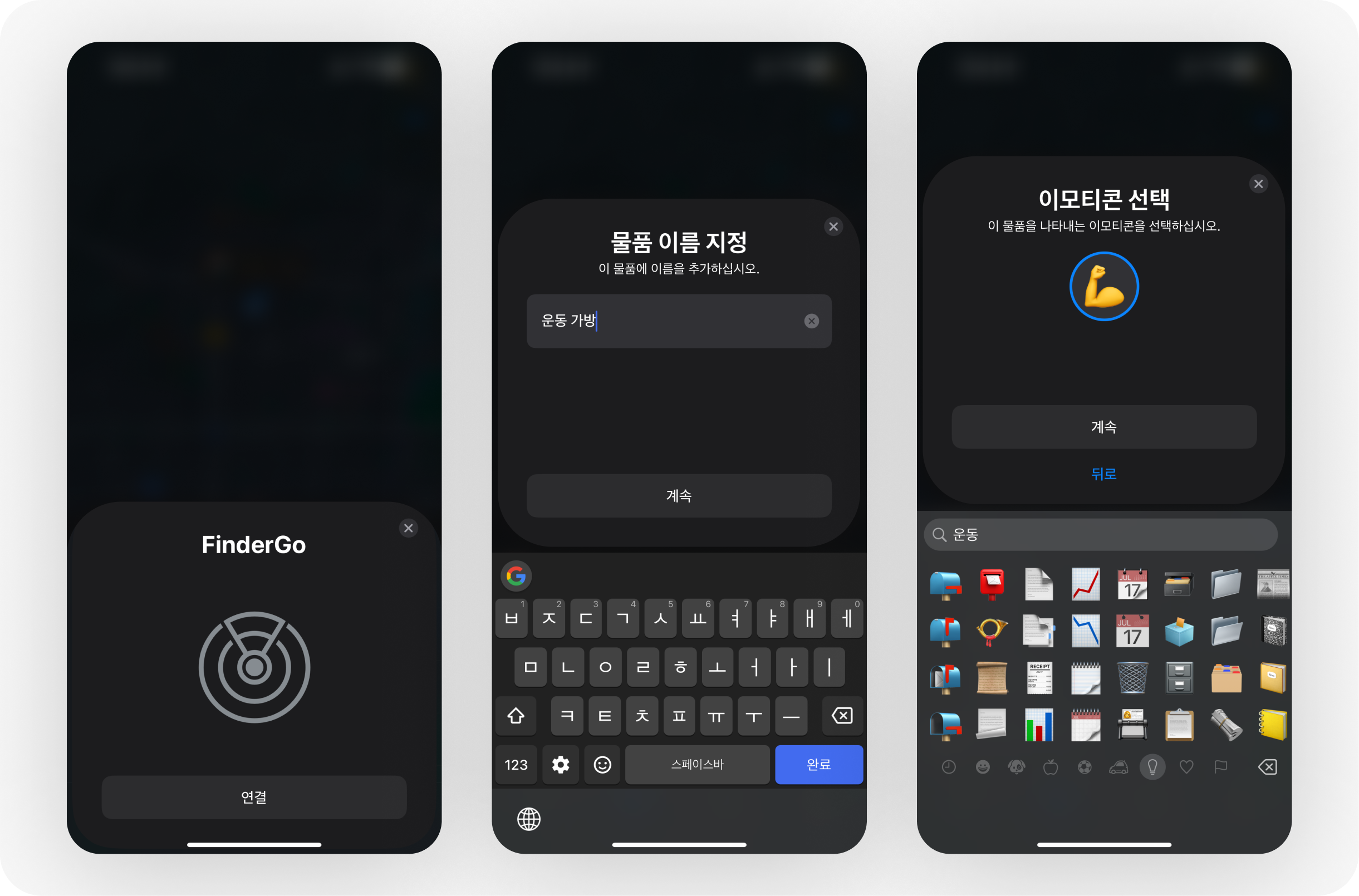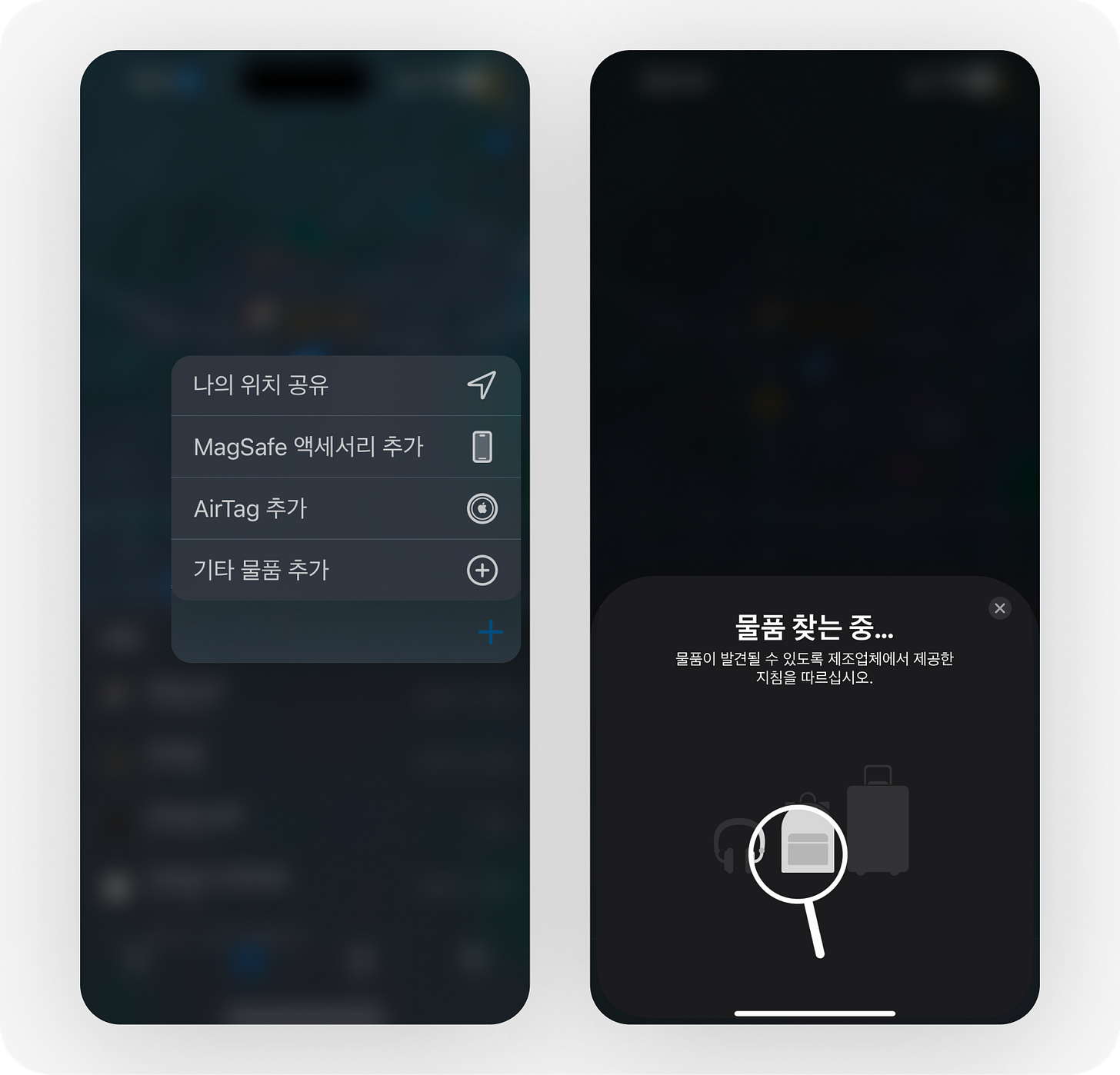 등록 방법은 간단합니다. 아이폰에서 '나의 찾기'를 실행한 후 '+' 버튼을 눌러 '기타 물품 추가'를 선택합니다. 동시에 스마트 태그 가운데를 손으로 '딸깍' 누르면 소리가 나면서 인식 및 등록 과정을 거칩니다.