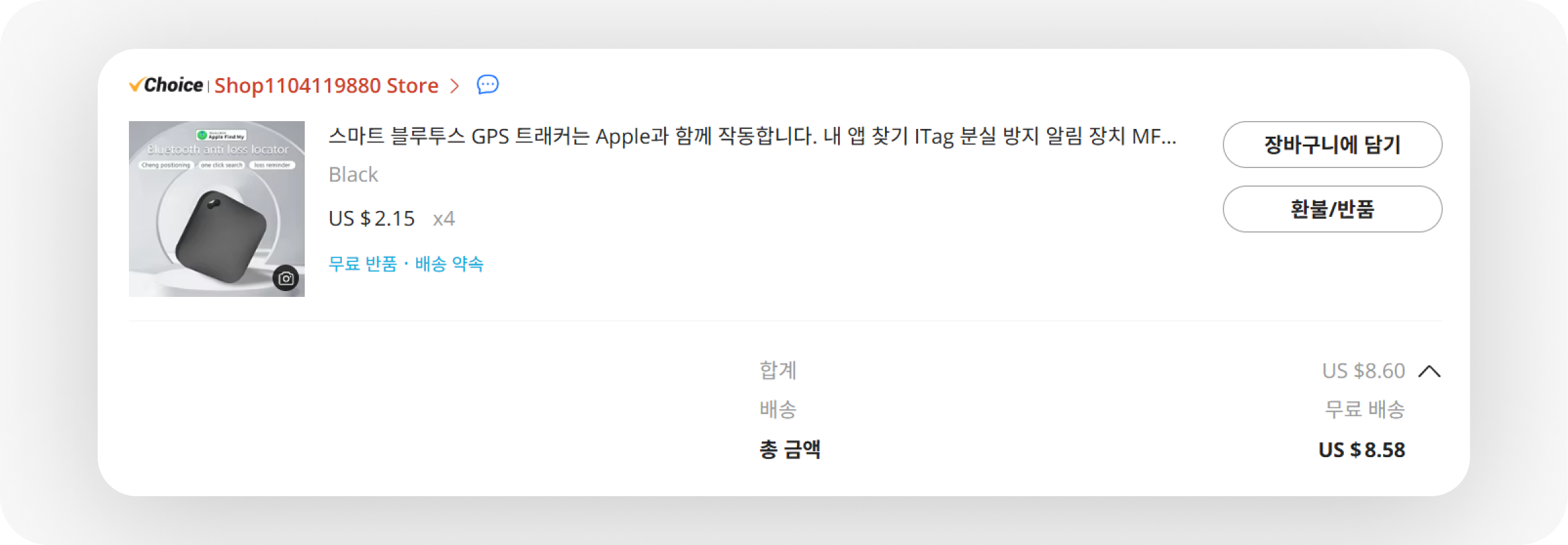 저는 이미 갤럭시 생태계를 사용하고 있어 보조적인 수단으로 UWB가 제공되지 않는 알리산 스마트 태그를 구매해봤어요. 개당 2.15달러로, 원화로 환산하면 3천 원입니다. 총 4개를 8.58달러(1만 2천 원)에 구매했습니다.