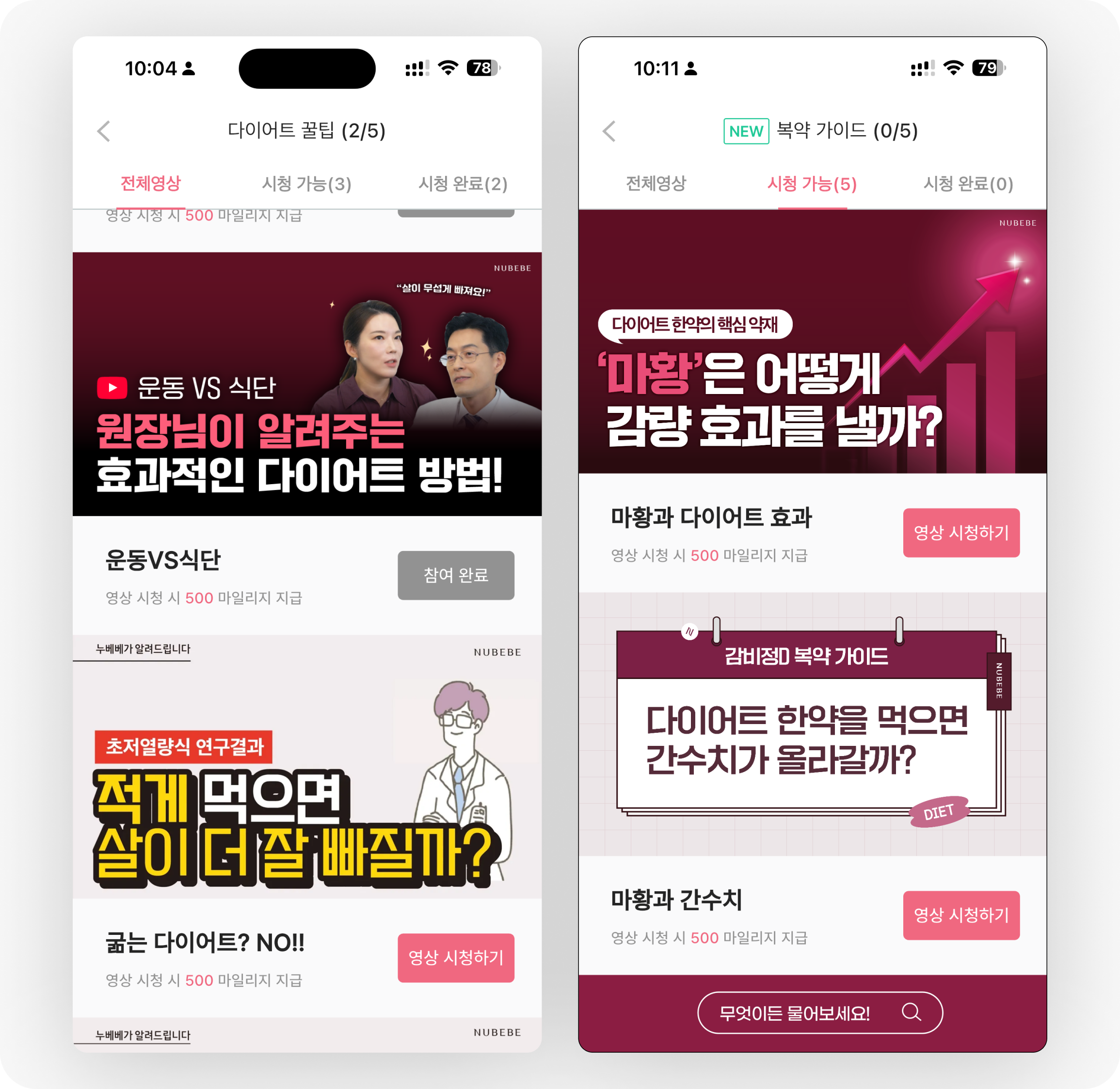 다행히 누베베 앱에서 동영상을 시청하면 5천원 마일리지를 받을 수 있어 조금이나마 할인을 받을 수 있습니다. 초진 환자라면 추천·소개 할인을 꼭 챙겨서 최대한 저렴하게 처방받으세요!