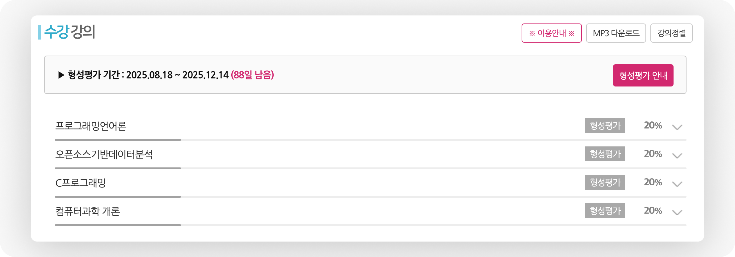 원래 계획은 주말에 두 과목, 평일 퇴근 후 한 과목씩 들어서 주당 2강씩 듣는 거였는데… 지금은 그냥 주말에만 몰아듣습니다. 굳이 스트레스 받을 필요는 없으니까요.