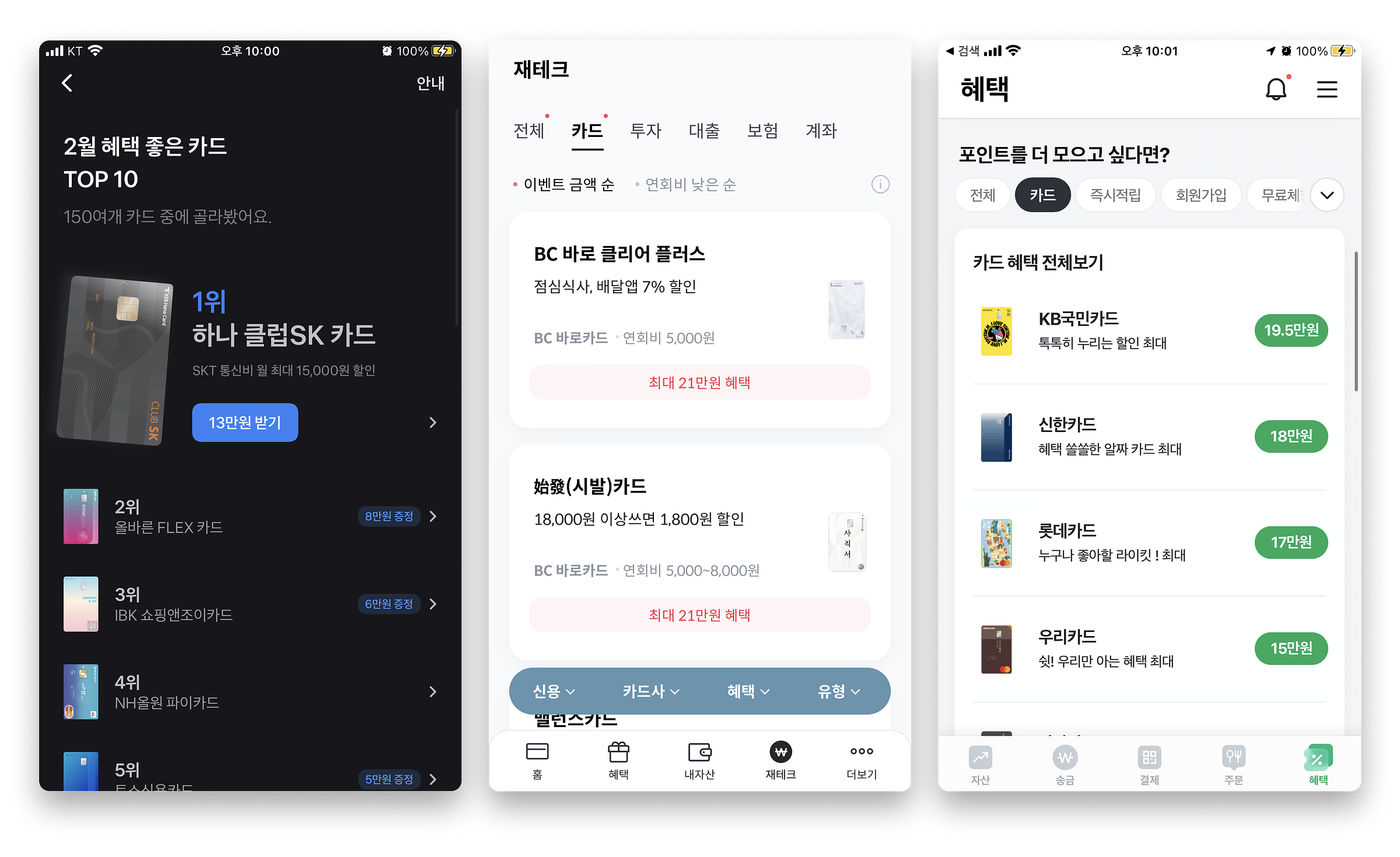 카드사에서 공식으로 발급받거나 카드 순위를 비교해 주는 곳(예: 카 X 고릴X)에서 발급받으면 기껏해야 대부분 연회비 면제가 전부인데요, 신규 카드 발급 시 신청을 어디서 하느냐에 따라 혜택이 달라집니다. 10~20만 원 상당의 페이백과 카드사&은행과 연계하여 첫 고객을 대상으로 고금리 적금에 가입할 수 있기 때문에 항상 카드사 신규 발급 전엔 꼭 다양한 발급 경로들을 찾아보셔야 합니다.