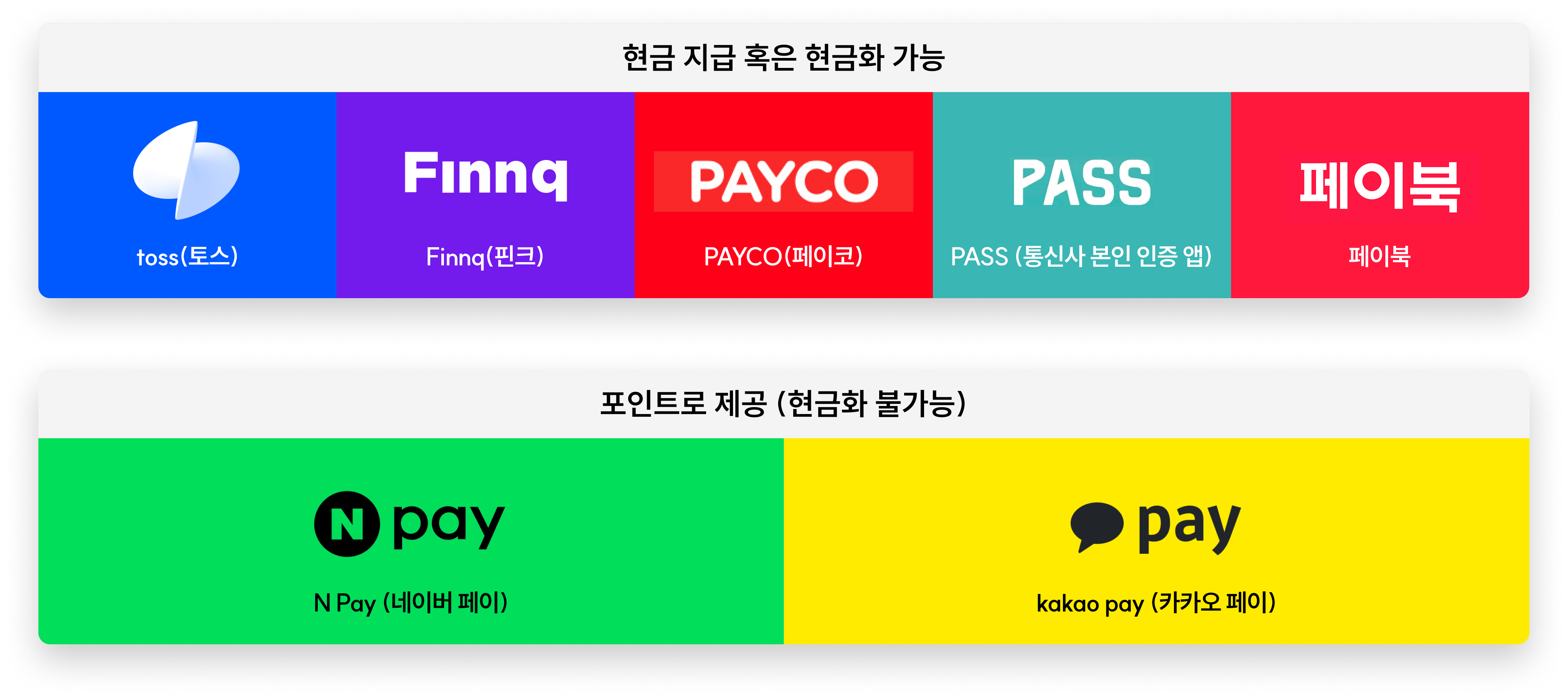 보통 현금 혹은 현금화가 가능한 페이백을 지급하지만 현금화가 불가능한 포인트로 페이백을 해주는 경우 막상 페이백 받아도 사용하기 어렵기 때문에 이러한 부분도 고민해 보셔야 해요. (예: 카카오 페이) 또한 매주 · 매월 혜택이 달라지는 점 참고해 주세요.