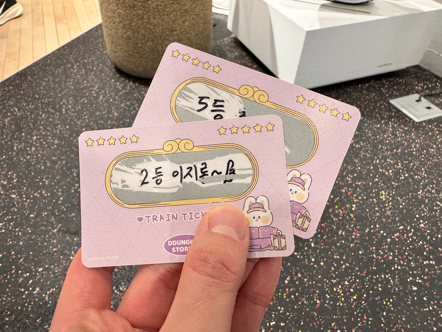 바닥에 널려 있는 수많은 추첨권 중에 하나를 뽑아 긁어보니, 2등 당첨 행운이 찾아왔어요. 함께 온 동료분도 5등에 당첨되어 기쁨이 두 배였어요.