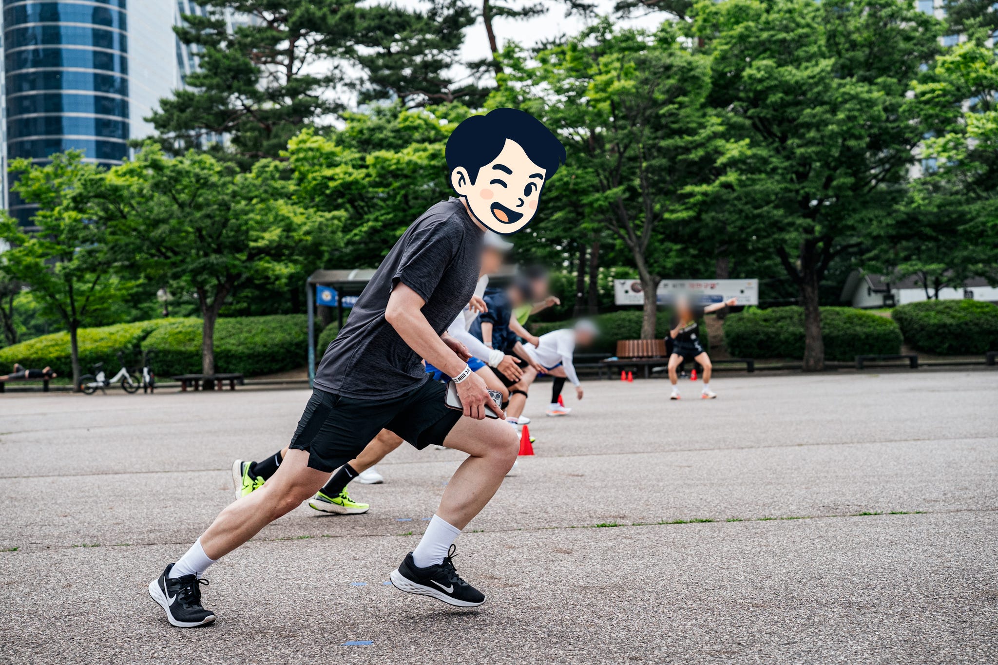 본격적인 러닝에 앞서 가볍게 몸을 풀고 여의도 공원을 달렸습니다. 러닝이 끝난 후에는 중앙 광장에 모여 남녀 A/B 그룹으로 나누어 미니 달리기 시합을 했어요.
