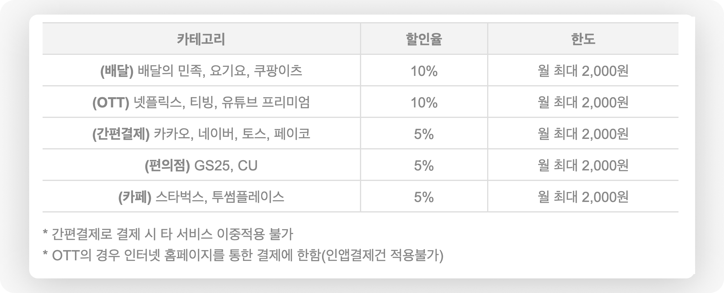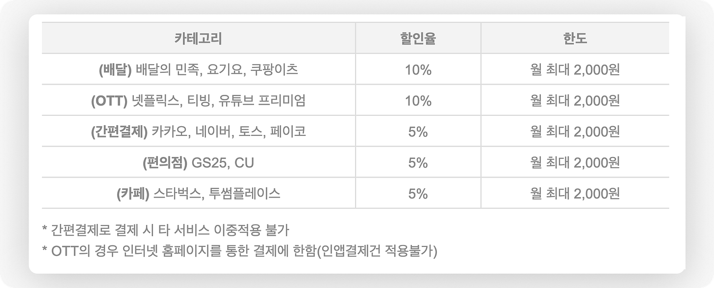 배달 앱(배달의민족, 요기요, 쿠팡이츠) 및 OTT(넷플릭스, 티빙, 유튜브 프리미엄) 이용 시 10% 할인이 돼요.