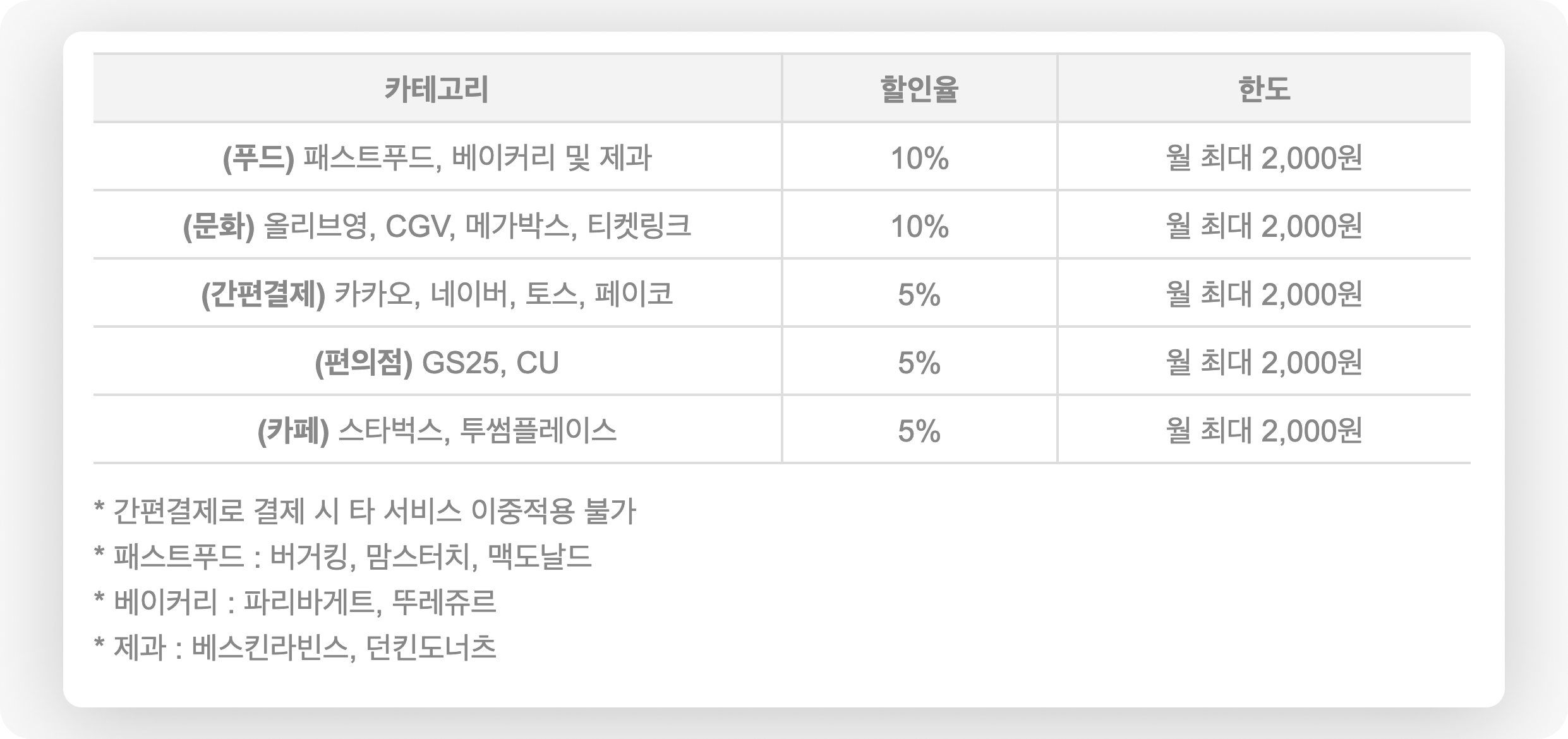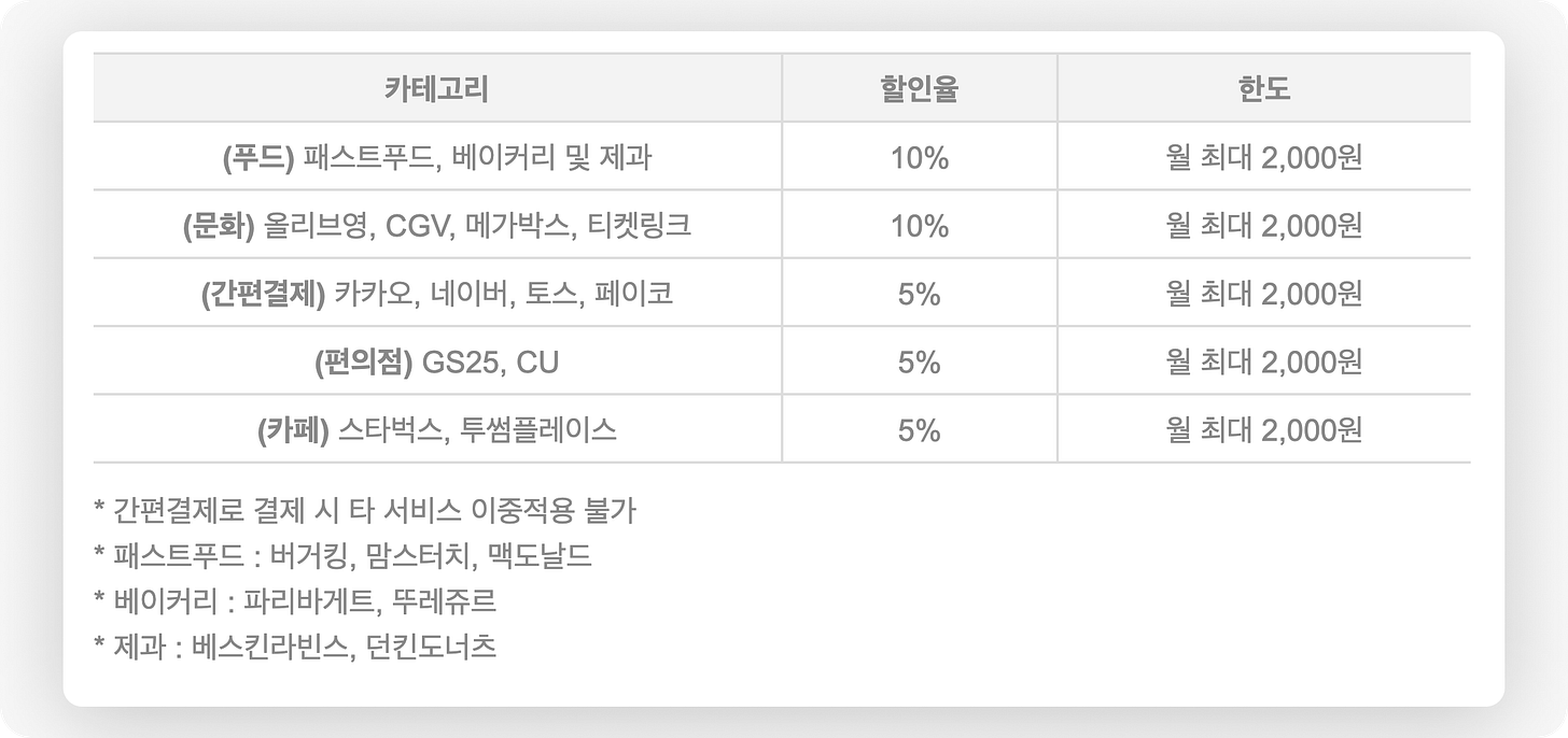 무실적 / 푸드(패스트푸드, 베이커리 및 제과), 문화(올리브영, CGV, 메가박스, 티켓링크) 10% 할인 / 간편결제 (카카오, 네이버, 토스, 페이코), 편의점 GS, CU), 카페(스타벅스, 투썸플레이스) 5% 할인